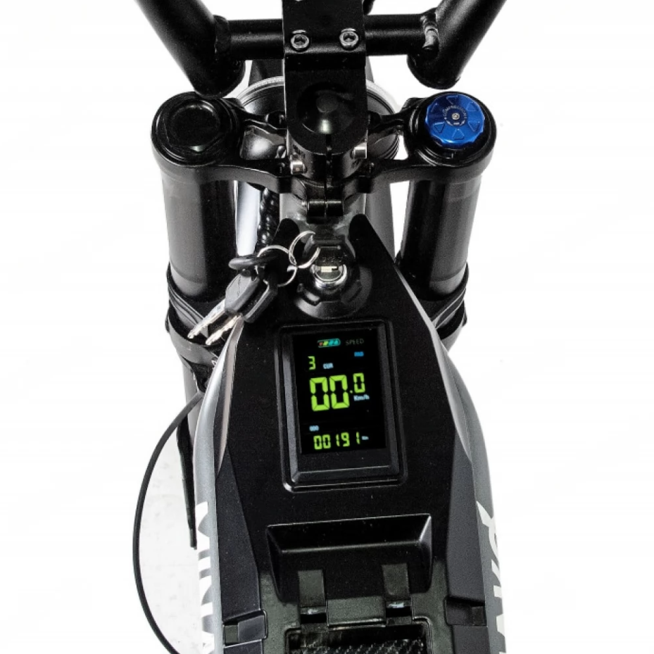 Рядом с ключом зажигания установлен полноценный бортовой компьютер с цветной индикацией. Он отражает все необходимые данные: скорость, пробег и заряд акб. Передняя фара позволяет кататься даже в темное время суток, а боковые зеркала на руле увеличивают угол обзора райдера. Модель можно оставить на улице, облокотив её на парковочную подножку.