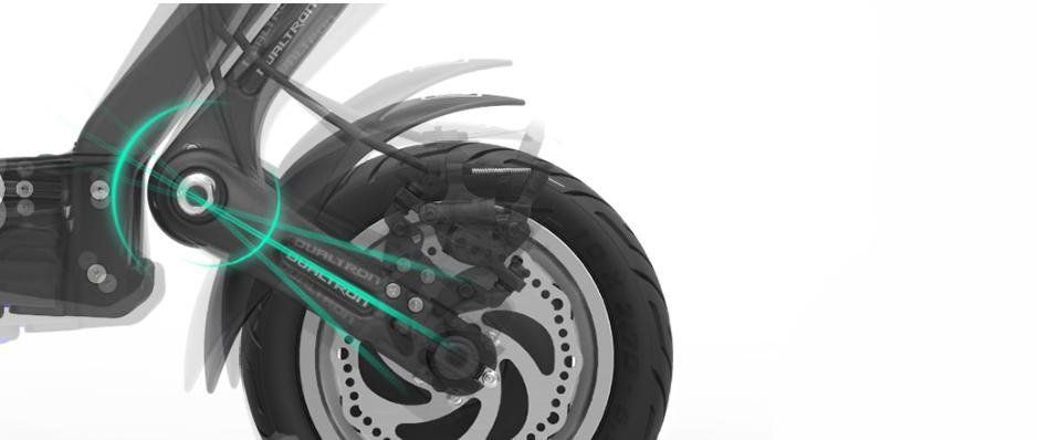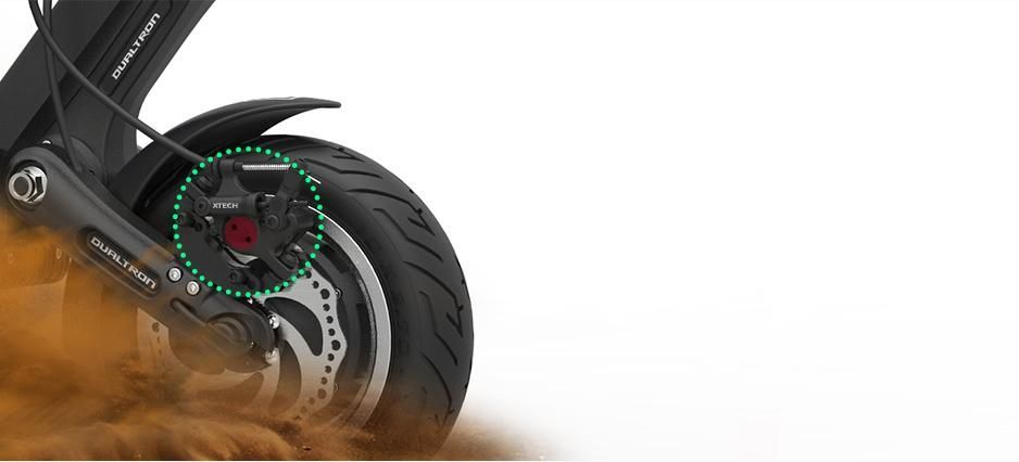 - Электросамокат Dualtron 3 имеет 2 тормоза. Благодаря им можно затормозить в два раза быстрее, что особенно необходимо в экстренных ситуациях.