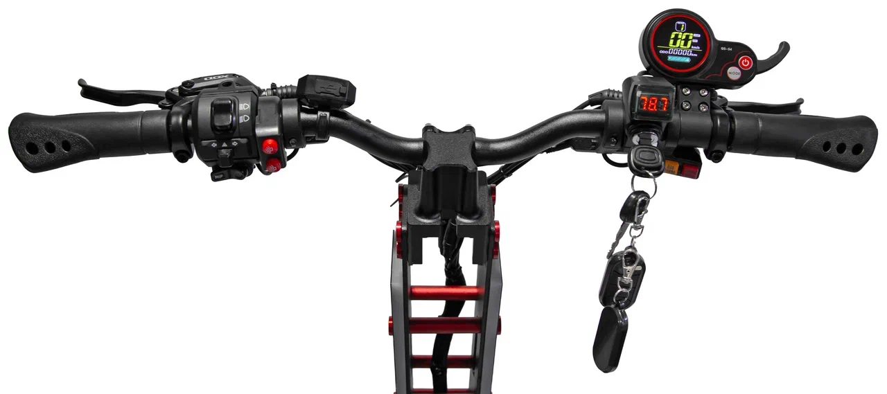 Электросамокат оснащен сиденьем, что добавляет удобства во время длительных поездок. Амортизация и гидравлические тормоза обеспечивают плавность хода и безопасность, что особенно важно при высокой скорости. Дисплей на руле предоставляет всю необходимую информацию о состоянии батареи и скорости, что позволяет легко контролировать поездку.