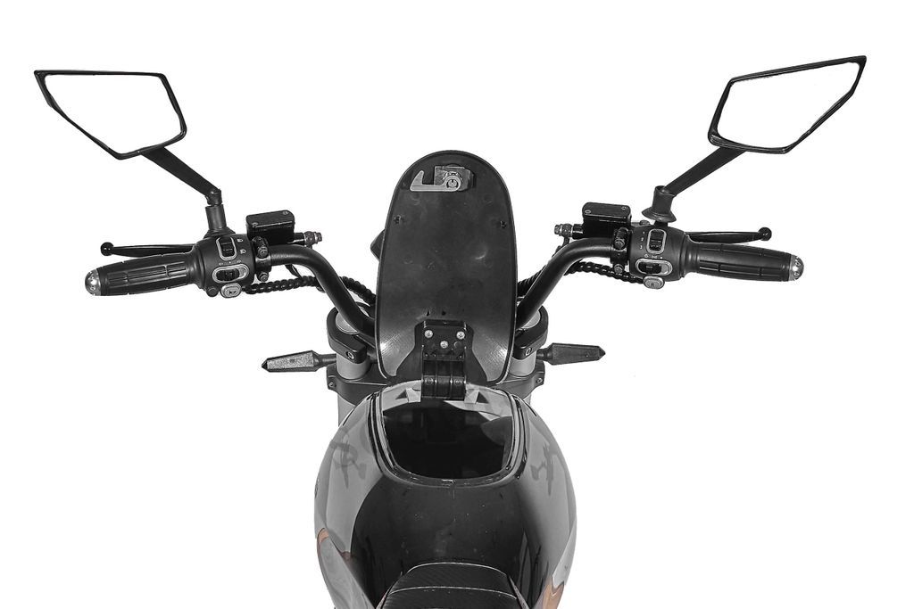 - В «баке»электроскутера расположен бардачок, а для пассажира предусмотрены подножки.