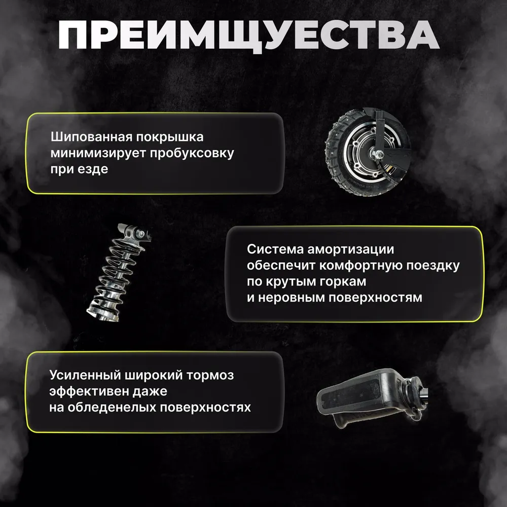 - Простая Эксплуатация: Подходит для проката, так как разряженную батарею можно легко заменить на заряженную. Заднее колесо фиксируется, обеспечивая легкость спуска с горки.
