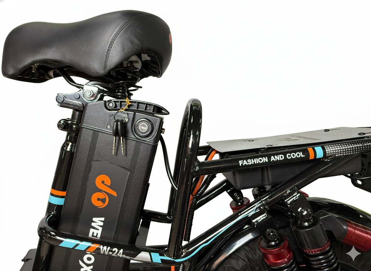 Электровелосипед WENBOX W24 PRO имеет цельную металлическую раму, что обеспечивает ему прочность и долговечность. Стильный и современный внешний вид делает его привлекательным для пользователей всех возрастов. Ручка газа мотоциклетного типа позволяет легко управлять скоростью, что добавляет удобства в эксплуатации.