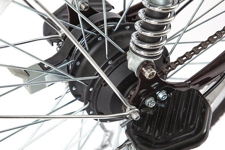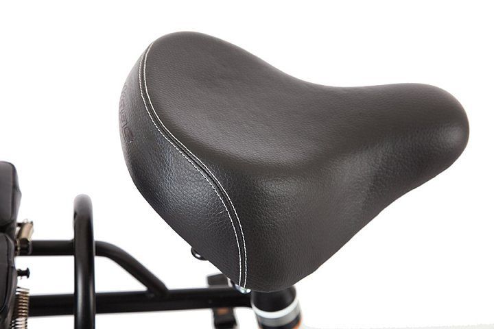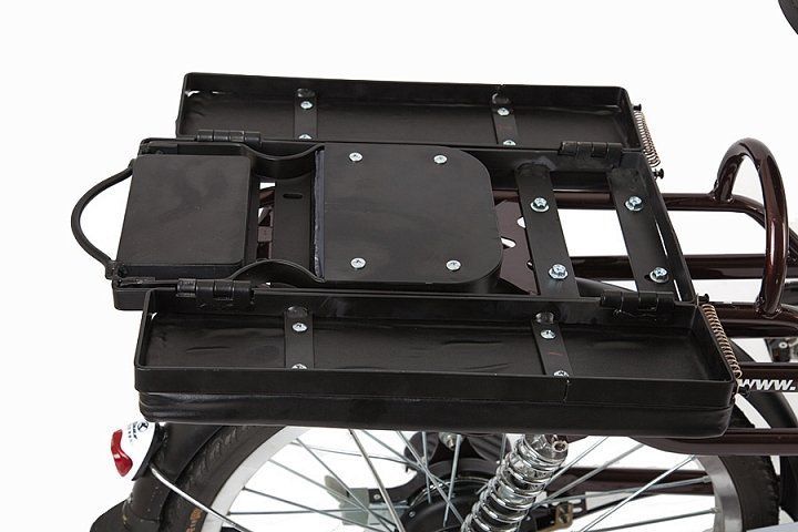 - Электровелосипед оборудован полноценным вторым сиденьем с мягким верхом для перевозки пассажира, которое можно разложить в ширину, увеличив площадь багажника для удобства перевозки габаритных грузов. Пара пружинных амортизаторов, расположенных под задним багажником, а также амортизационная вилка спереди позволят сделать поездку максимально комфортной.